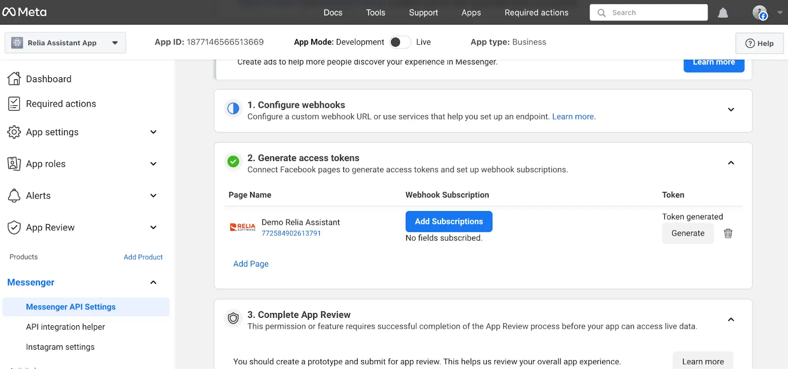 - Subscribe our Facebook Page ("Demo Relia Assistant") to the webhook to begin sending and receiving messages.