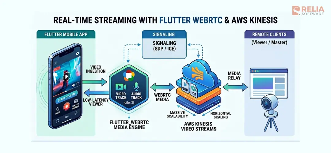 In this blog, you’ll learn how Kinesis Video Streams WebRTC works, why it’s better for low-latency streaming, and how to implement it step by step in a Flutter app. We’ll break down the architecture, signaling flow, and real-world challenges so you can build a stable, production-ready streaming system.