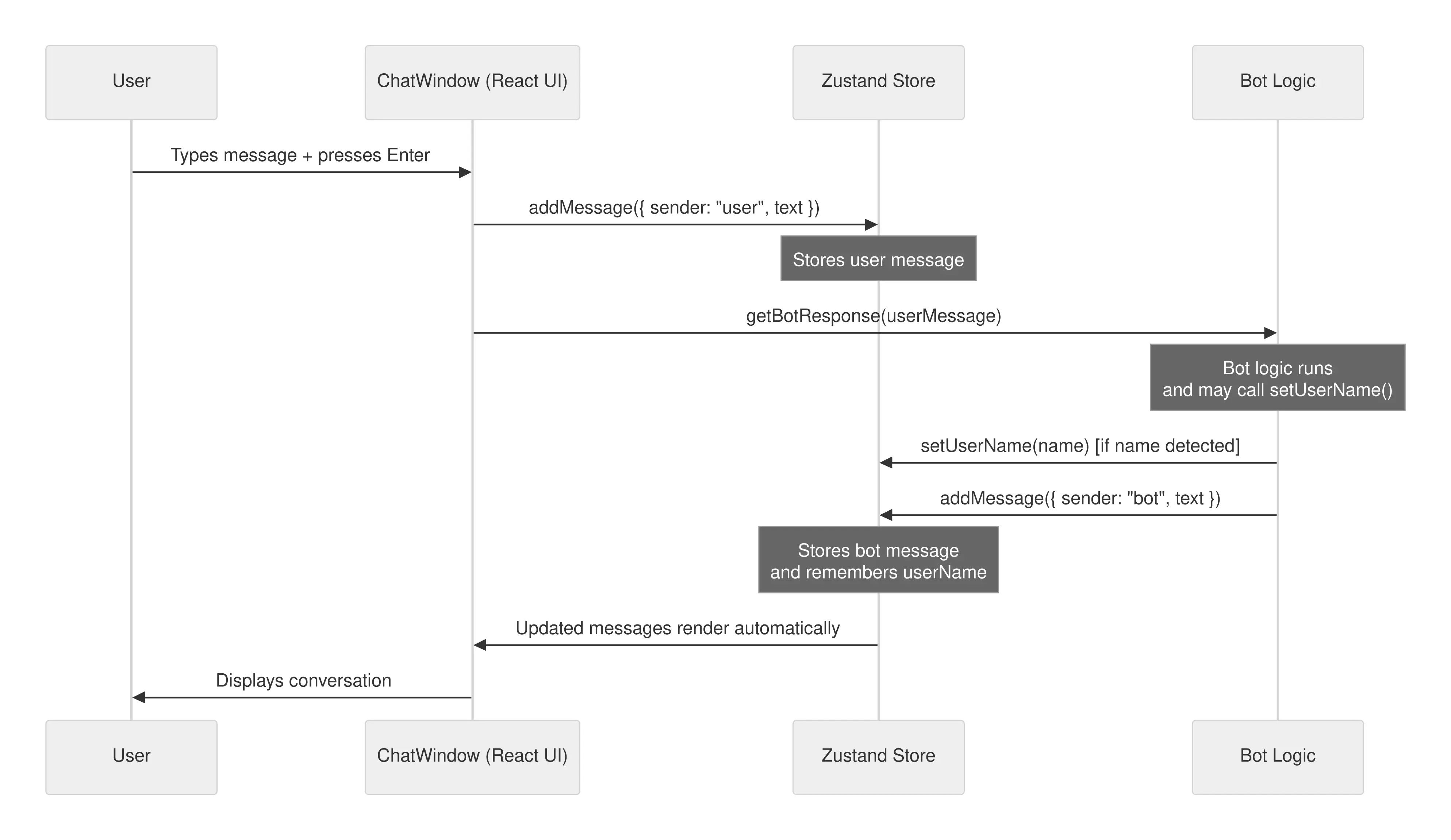 Here’s a simple diagram showing how messages move between the user, the chatbot UI, and the global state store.