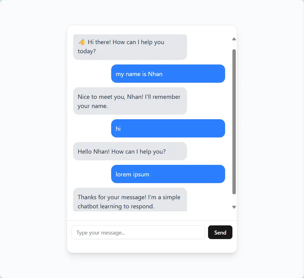 hook we built earlier, handles user input, and simulates bot replies. Notice how the bot can remember your name once you introduce yourself, and greet you personally in future messages.